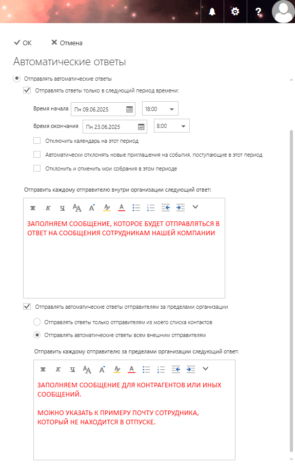 Либо включить автоответ на постоянной основе . Выходя из отпуска или больничного, требуется отключить эту функцию!!!