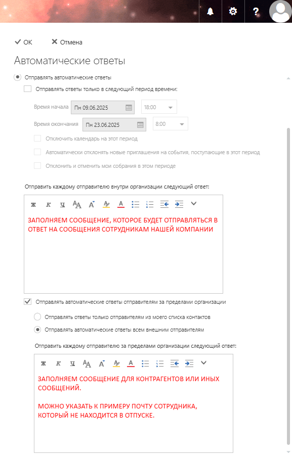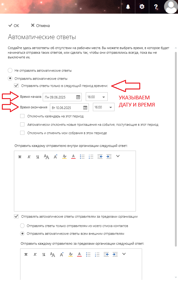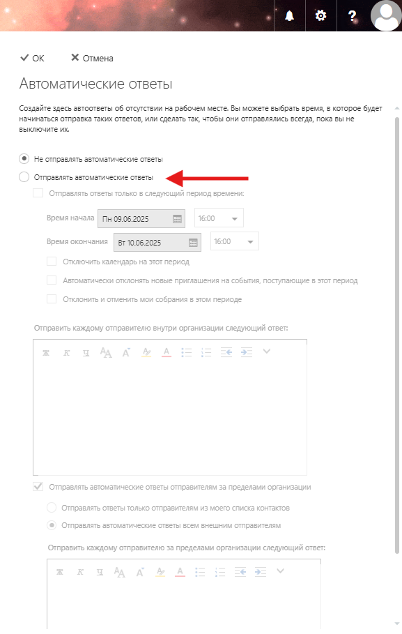 Настройка автоответа в период отпуска
